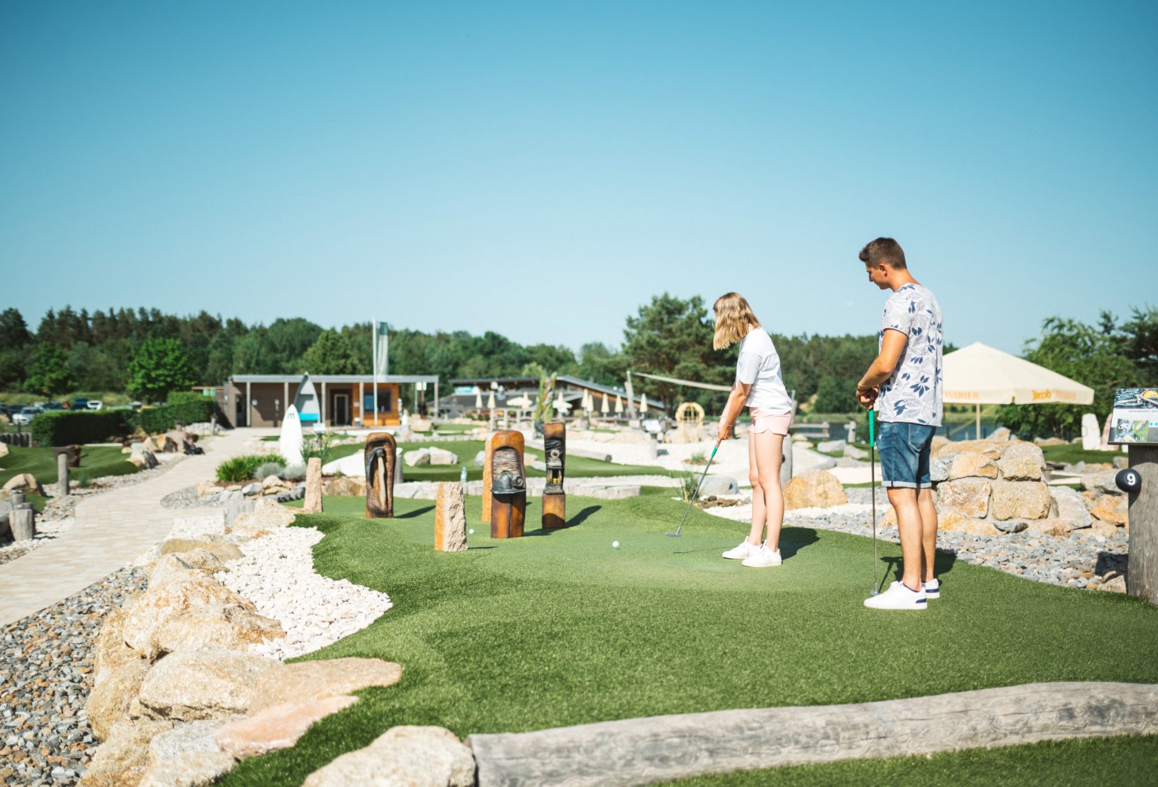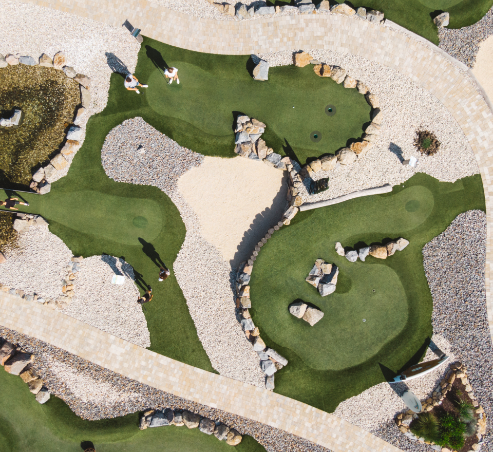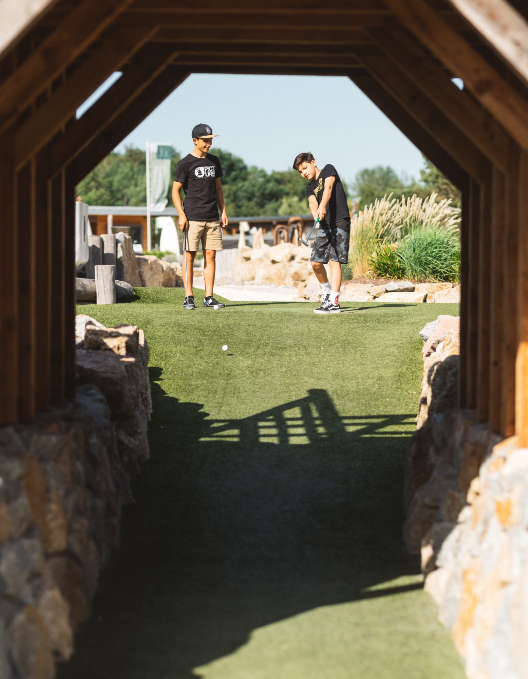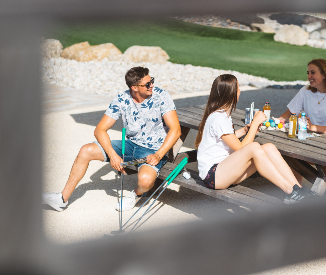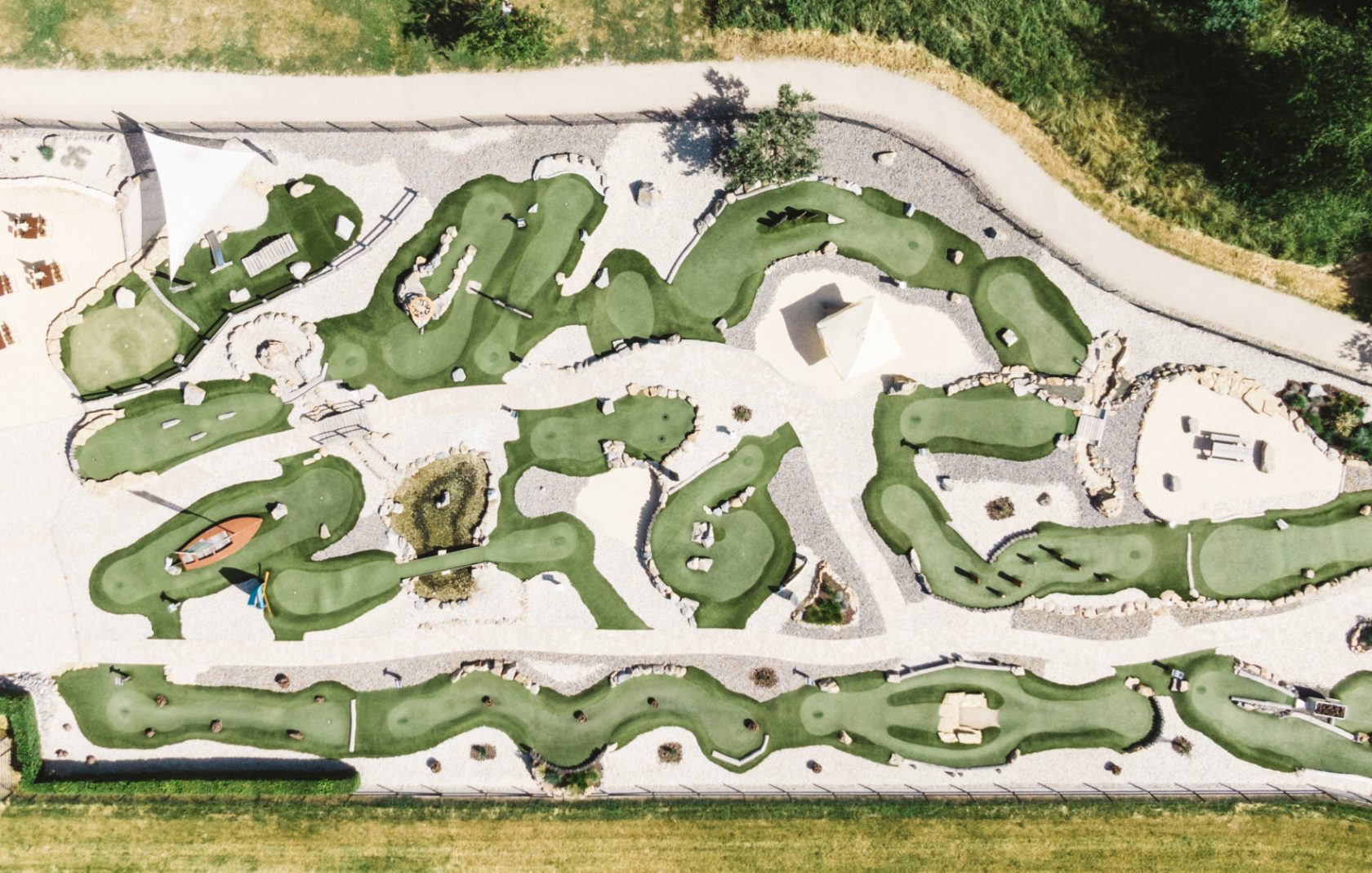 Bei uns wird auf Kunstrasen gespielt. Groß und Klein können sich sportliche Duelle liefern, oder gemütliche Runden mit Freunden oder der ganzen Familie spielen.